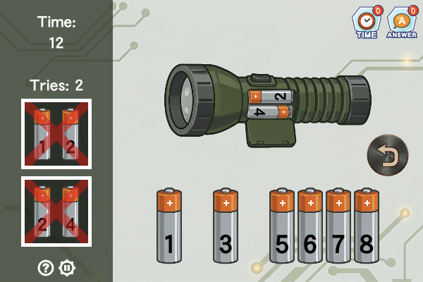 الهدف هو تشغيل مصباح يدوي باستخدام بطاريتين جيدتين بالضبط من مجموعة تتكون من ثماني بطاريات إجمالاً، مقسمة بالتساوي بين أربع جيدة وأربع سيئة. بعد كل محاولة، تتم إزالة البطاريات عن طريق النقر على زر العودة حتى تتمكن من اختبار مجموعة جديدة. التحدي الأساسي هو صياغة استراتيجية منهجية تضمن النجاح بأقل عدد ممكن من المحاولات—الاعتماد على الحظ غير كافٍ. يتم تحديد ترتيبك النهائي من خلال سرعة الإنجاز والحد الأدنى لعدد المحاولات المطلوبة.